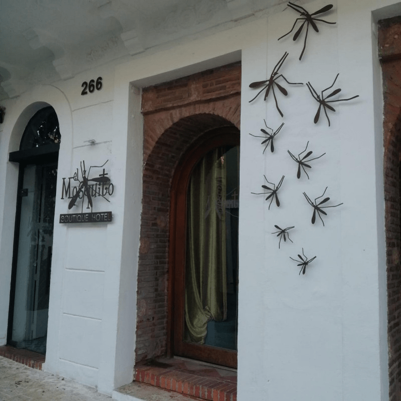 La fachada junto a la heladería está adornada con siluetas de mosquitos. Es la casa que aloja el Mosquito Boutique Hotel, con un bar de escasa iluminación. Una puerta abre hacia el pasillo del hotel y patio. Echo un vistazo. Es lindo.