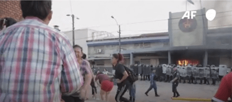 Un sinnúmero de presidiarios fueron vistos en los techos del edificio principal del presidio arrojando cascotes a los antimotines, al tiempo que la televisión exhibió grandes llamaradas de fuego en el interior, atizada por colchones.