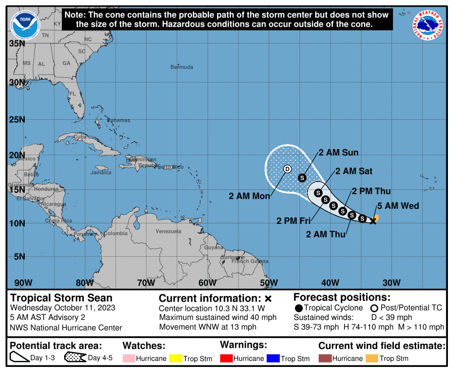 Se formó este miércoles la tormenta tropical Sean en el océano Atlántico, en tanto que una onda tropical localizada detrás de ese sistema tiene un 20 % de probabilidad de convertirse en ciclón tropical.