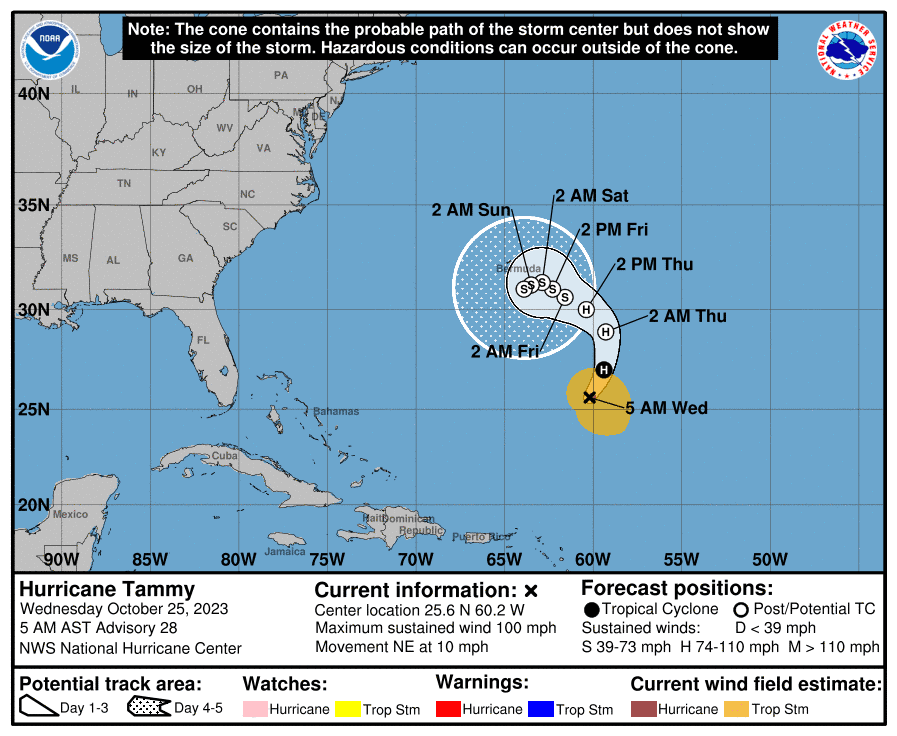 El huracán Tammy fue localizado a unos 870 kilómetros al sur/sureste de Bermuda con vientos máximos sostenidos de 155 kilómetros por hora.