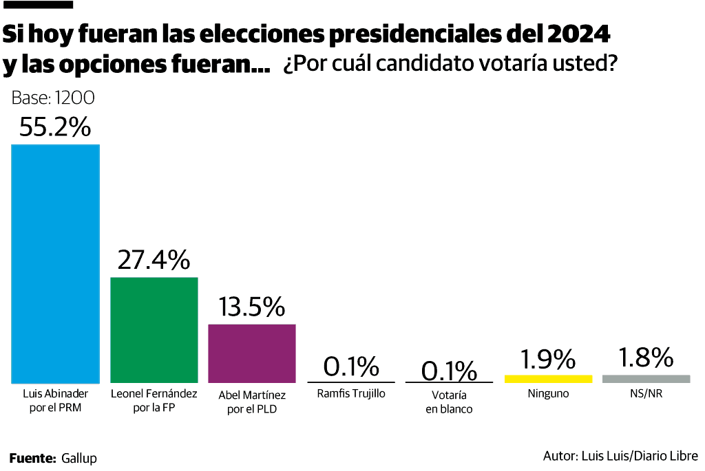 Si las elecciones presidenciales fueran hoy, no habría necesidad de una segunda vuelta, pues el presidente Luis Abinader y su Partido Revolucionario Moderno (PRM) se alzarían con el triunfo holgado, al alcanzar el 55.2 % de los votos, según los resultados de la encuesta Gallup-RCC Media.