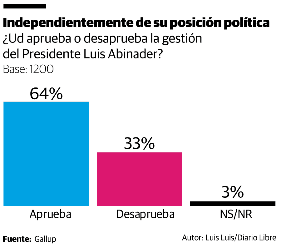 A escasos seis meses de las elecciones presidenciales de mayo de 2024, un 64 % de los encuestados por Gallup-RCCMedia aprueba la gestión de Luis Abinader, frente a un 33 % que la desaprueba. Y llevando a más a profundidad la pregunta, un 56 % considera que la gestión del presidente Abinader es Muy buena (10.1 %) o Buena (46.0 %).