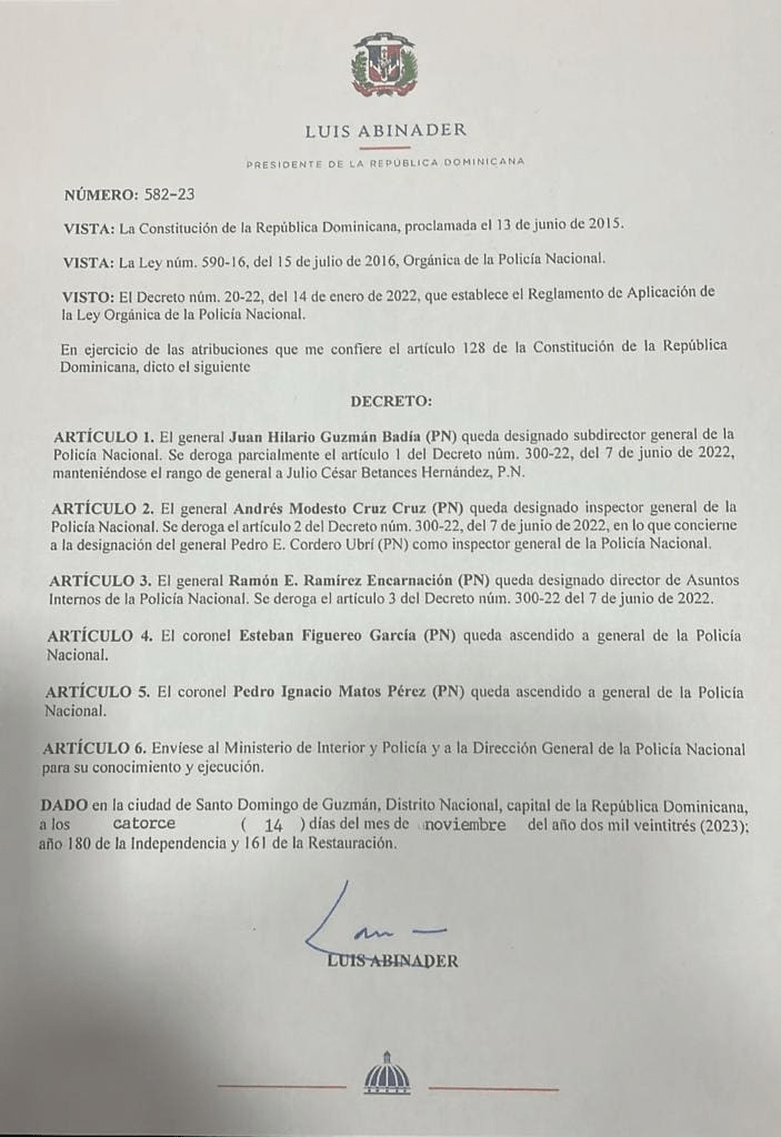 El presidente Luis Abinader emitió este martes el decreto 582-23, a través del cual realiza los primeros cambios en la Policía Nacional, luego de que el mayor general Ramón Antonio Guzmán Peralta asumiera la función de director de la institución.