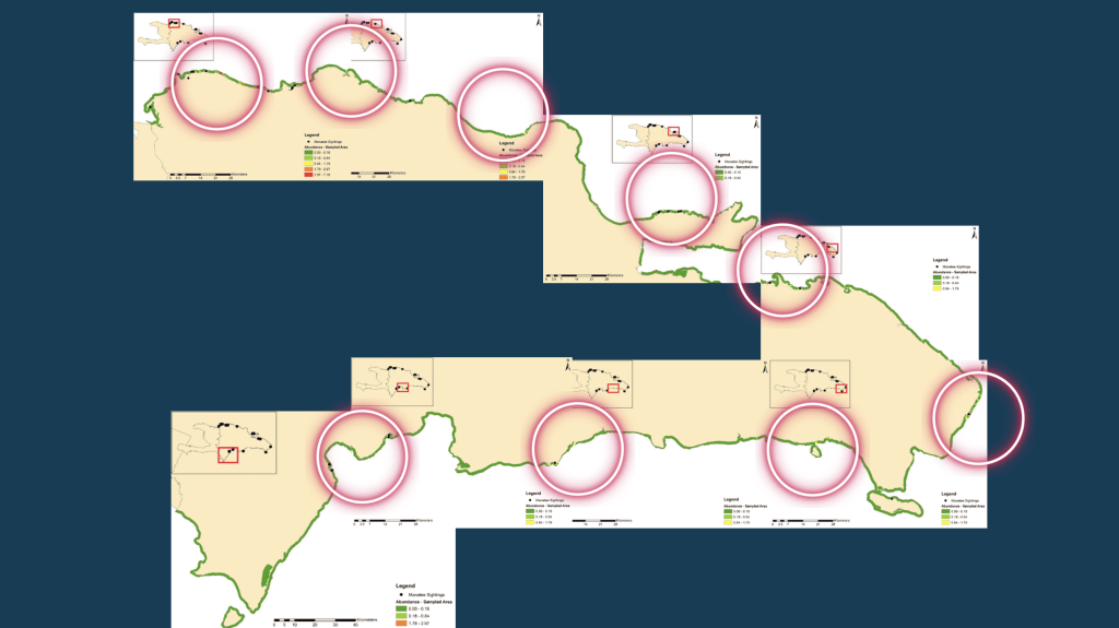 La metodología usa un modelo predictivo para estimar la población, la cual se basa en el registro visual de individuos desde un avión que recorrió la totalidad de la costa dominicana en tres días. Así también se analiza un modelo de distribución basado en variables ambientales como hábitat, distancia a ríos, profundidad, etc.