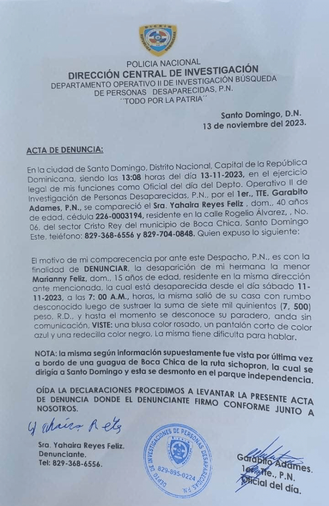 La denuncia fue presentada el lunes ante la Policía Nacional, en el Departamento de Búsqueda de Personas Desaparecidas, por la hermana de la desaparecida, la joven Yahaira Feliz.