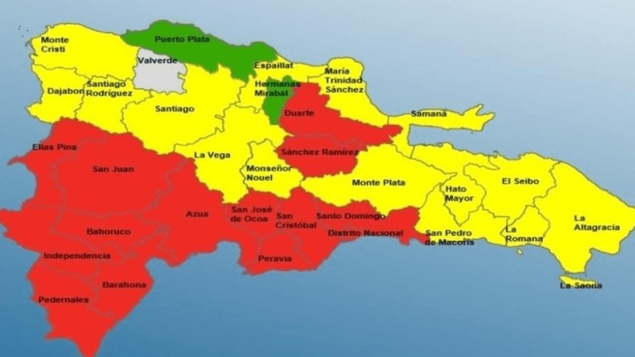 Las provincias en alerta roja son Pedernales, San Juan, Barahona, Azua, San José Ocoa, Bahoruco, Independencia, Elías Piña, San Cristóbal, Peravia, Sánchez Ramírez, Distrito Nacional, Santo Domingo y Duarte en especial el Bajo Yuna.