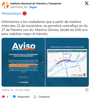 A través de su cuenta en la red social X, antigua Twitter, Intrant explicó que este contraflujo permitirá a los conductores que vienen de este-oeste «incorporarse más adelante, a los carriles expresos de la avenida 27 de Febrero en el mismo sentido este-oeste».
