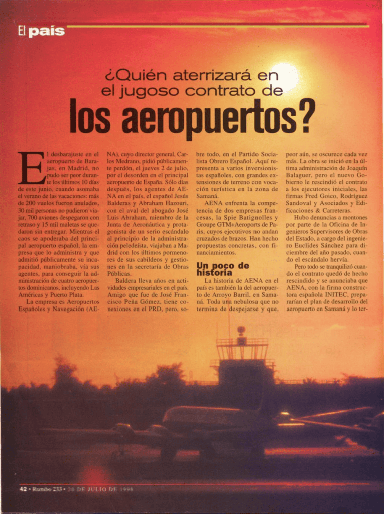 La histórica publicación refería los aprestos para convocar una licitación apresuradamente, y mencionaba como aventajados postulantes al «español Jesús Barderas y Abraham Hazoury, con el aval del abogado José Luis Abraham, miembro de la Junta Aeronáutica y protagonista de un serio escándalo al principio de la administración peledeísta». También decía que su iniciativa «viaja en primera clase, con viento de cola y parecería que la tripulación está a su servicio».