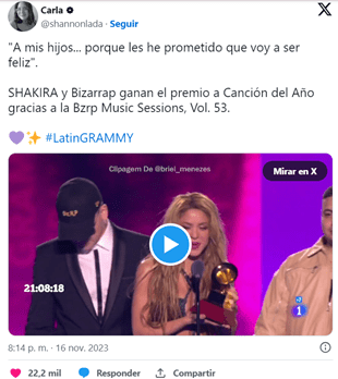 «A mis hijos le dedico este premio porque les he prometido que voy a ser feliz«, fueron las palabras de la artista cuando subió a recoger el Latin Grammy a la Canción del Año gracias a la Bzrp Music Sessions, Vol. 53.