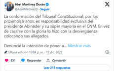 El candidato del Partido de la Liberación Dominicana reaccionó duramente frente a la selección de los cinco nuevos miembros del Tribunal Constitucional. «La conformación del TC por los próximos nueve años es responsabilidad exclusiva del presidente Abinader y su súper mayoría en el CNM. En vez de casarse con la gloria lo hizo con la desvergüenza colocando sus allegados», escribió Abel Martínez en su cuenta en X.