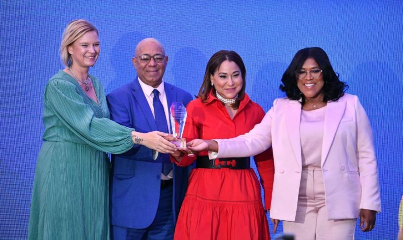 La ministra de la Mujer, Lic. Mayra Jiménez encabezó el acto junto a la Sra. Inka Mattila, representante del PNUD en el país, realizaron la entrega del Sello Oro obtenido por Vega Real a Yanio Concepción y María Eugenia Acosta, presidente ejecutivo y gerente general, respectivamente.