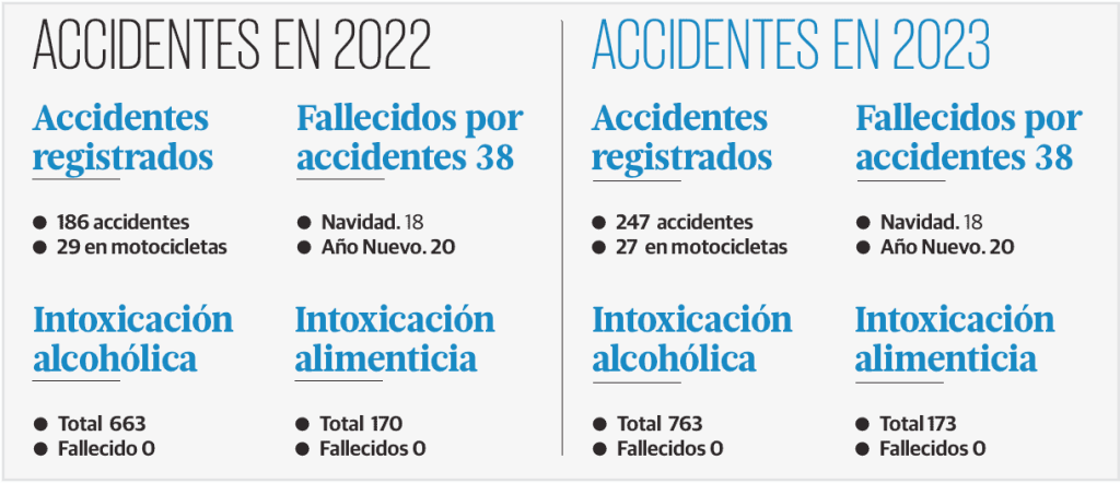 El Centro de Operaciones de Emergencias (COE) reportó la muerte de 38 personas durante las festividades de Navidad y Año Nuevo de 2023, igual cantidad que en el año 2022, pero con un aumento de 61 accidentes más con relación al año anterior.
