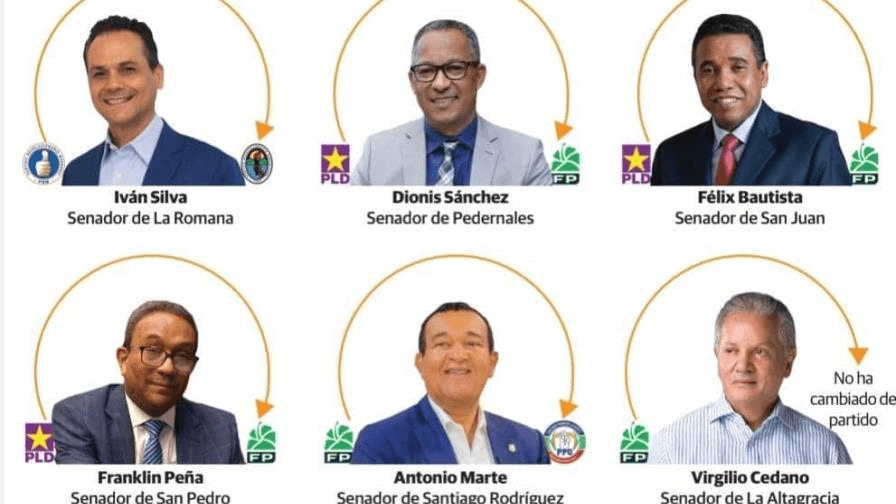 Los senadores que han optado por renunciar a partidos en ingresar en otros son Dionis Sánchez (Pedernales), Félix Bautista (San Juan) y Franklin Peña (San Pedro de Macorís), quienes militaron por años en el Partido de la Liberación Dominicana (PLD), pero una vez que obtuvieron su curul se juramentaron en la Fuerza del Pueblo, quitándole así la segunda mayoría senatorial que ostentaba el partido morado.