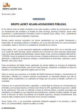 Luego de estas declaraciones, el Grupo Lackey emitió una nota de prensa en el que niega las acusaciones de Contreras. Lo primero que niega es que la empresa no esté dedicada a labores relacionadas al concepto por el que fue contratada.