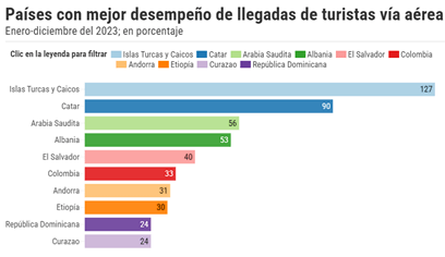 Las Islas Turcas y Caicos fueron el destino que lideró el crecimiento en la llegada de turistas vía aérea en el 2023, con un 127 %. Catar, Arabia Saudita y Albania le siguieron, con incrementos del 90, 56 y 53 %, respectivamente.