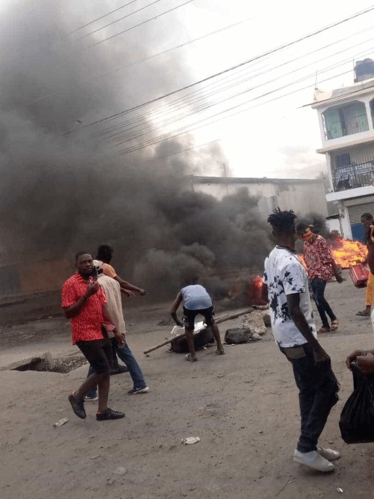 Los manifestantes en territorio haitiano en Juana Méndez quemaron neumáticos y bloquearon las calles mientras los policías de ese territorio permanecen en vigilancia.