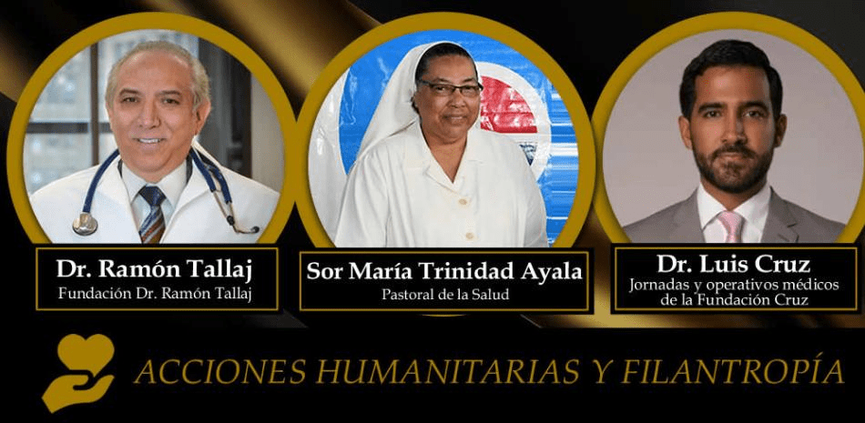 En la categoría Acciones Humanitarias y Filantropía, el doctor Ramón Tallaj líder de la Fundación Dr. Ramón Tallaj, Sor María Trinidad Ayala Adames de la Pastoral de la Salud, y el doctor Luis Cruz por la Visita de la Salud una iniciativa creada para abarcar todo el territorio nacional, visitando las 32 provincias con el propósito de identificar casos de emergencia o pobreza que requieran asistencia médica.