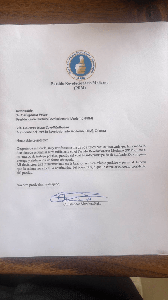 En una misiva dirigida al presidente del PRM, José Ignacio Paliza, enviada a través de Jorge Hugo Cavoli Balbuena, presidente de la organización en Cabrera, expresó: «Mi decisión está fundamentada en la base de mi crecimiento político y personal».