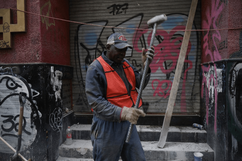 En una calle de la capital mexicana, cinco haitianos taladran el pavimento para instalar tuberías cerca de un cine abandonado.