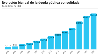 Los compromisos financieros del Estado continúan en aumento. Solamente en enero del 2024, la deuda pública consolidada -que integra las deudas del sector público no financiero (SPNF) y el Banco Central de la República Dominicana- aumentó 431 millones de dólares, pasando de 73,664.2 millones de dólares a diciembre del 2023 a 73,664.2 millones en el primer mes del presente año.