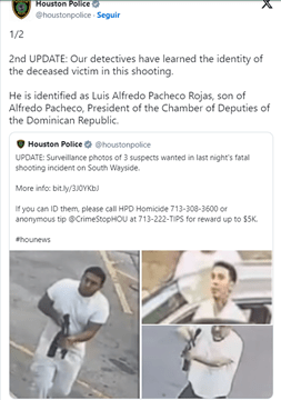 El Departamento de Policía de Houston confirmó este miércoles la identidad del hijo del presidente de la Cámara de Diputados, Alfredo Pacheco, fallecido durante un tiroteo en una gasolinera de la mencionada ciudad.