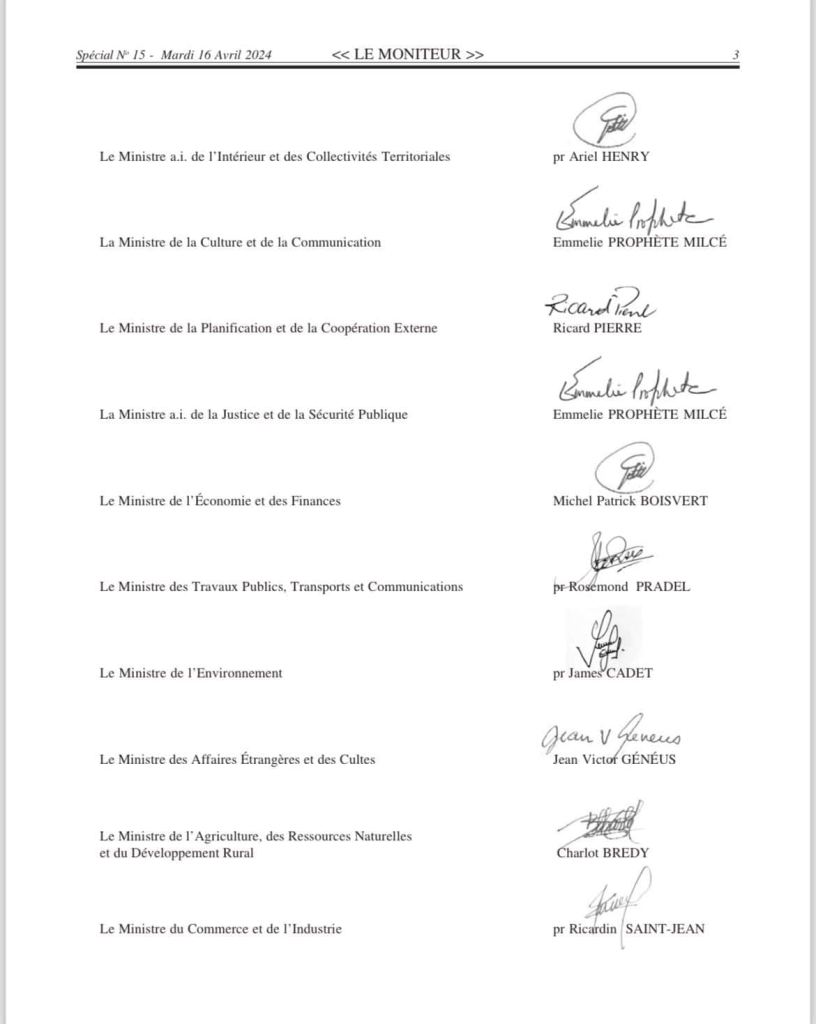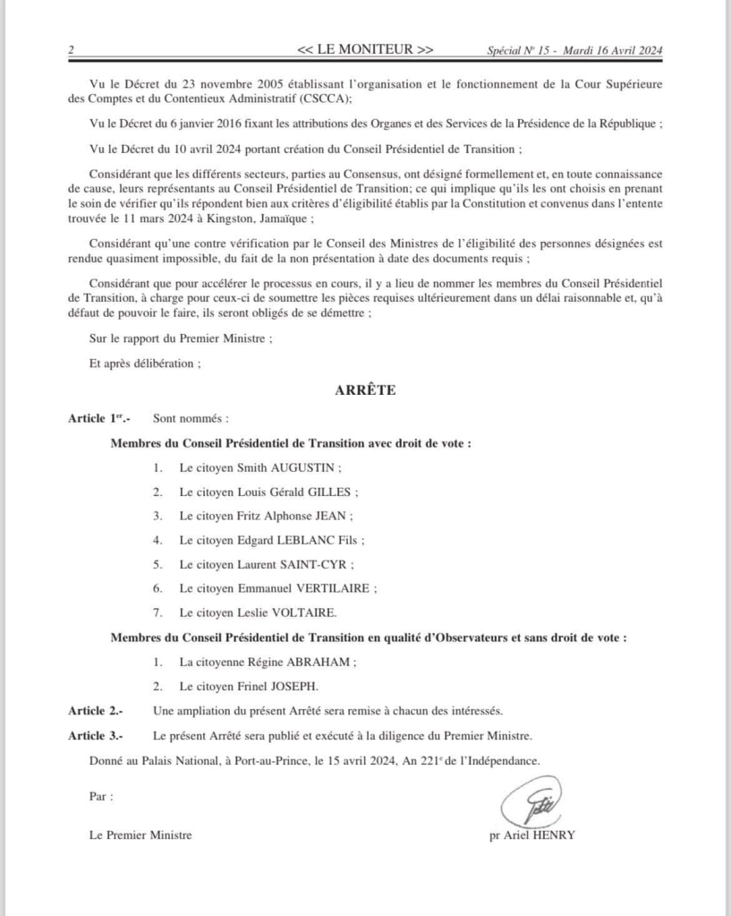 En tanto que se está a la espera de que los nueve miembros del Consejo Presidencial sean juramentados y tomen las riendas del gobierno, luego de que la actual gestión dimisionaria del primer ministro, Ariel Henry, diera a conocer el decreto que los nombra y de que fuera publicado oficialmente este martes 16 de abril en el diario Le Moniteur.