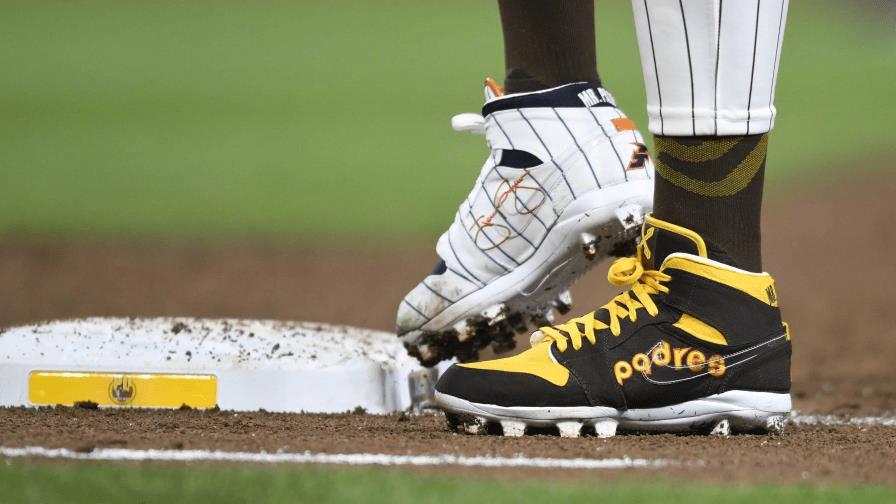 La estrella de los Padres de San Diego entró a la tercera base con su zapato derecho, diseñado con el aspecto de las camisetas blancas a rayas del equipo de 1998, cuando Gwynn llevó a los Padres a su Serie Mundial más reciente.