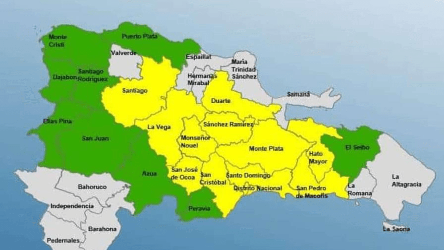 Las provincias en alerta amarilla son: Santo Domingo, Distrito Nacional, Santiago, La Vega, Monseñor Nouel, San José de Ocoa, Hato Mayor, San Pedro de Macorís, San Cristóbal, Monte Plata, Duarte y Sánchez Ramírez.