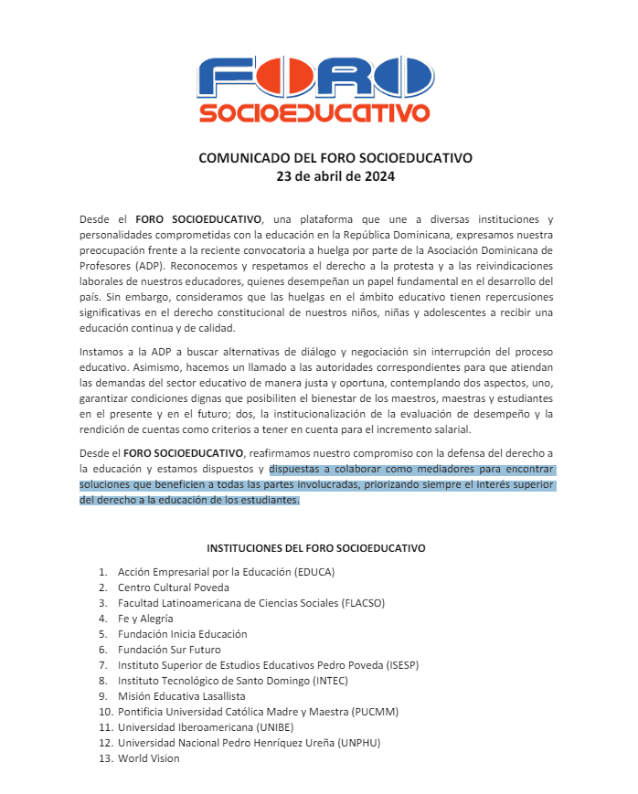 «Estamos dispuestos a colaborar como mediadores para encontrar soluciones que beneficien a todas las partes involucradas, priorizando siempre el interés superior del derecho a la educación de los estudiantes», concluyó el comunicado.