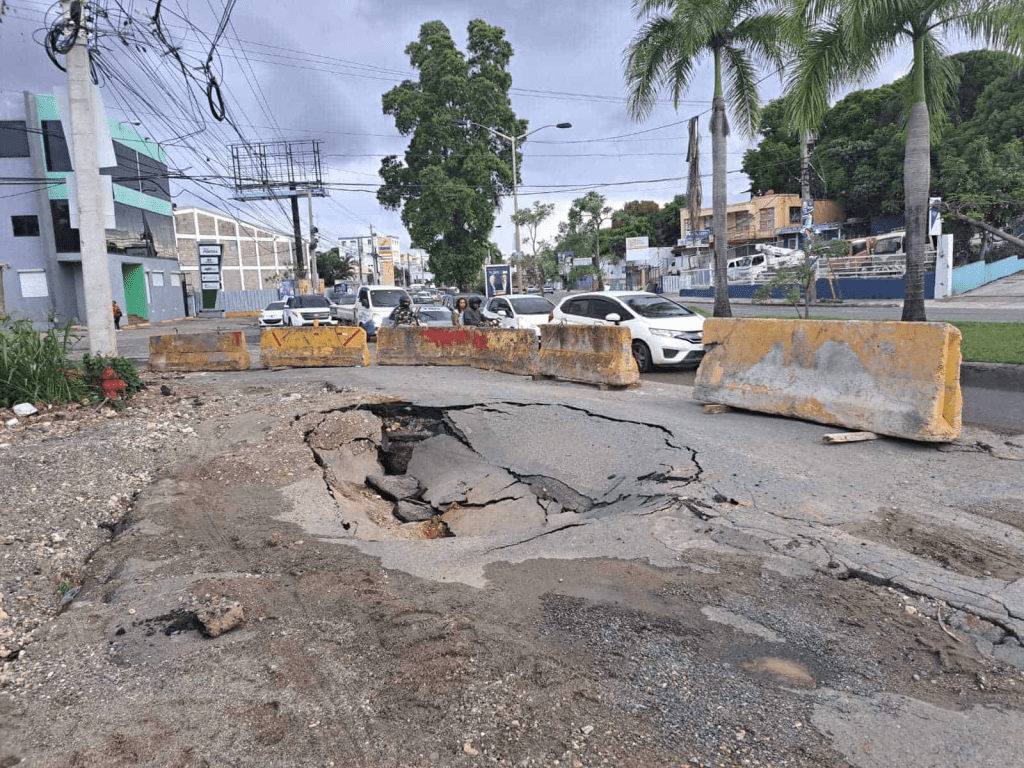 Un hundimiento en un tramo de la prolongación avenida 27 de Febrero, casi llegando a la autopista Duarte, se ha producido luego de las lluvias caídas en las últimas semanas.