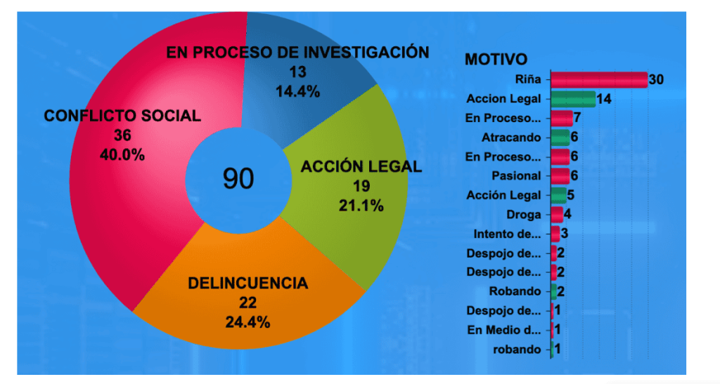 En los primeros 26 días del mes de abril, la Policía Nacional registró 90 homicidios en República Dominicana. De estos, el 40 % corresponde a conflictos entre ciudadanos, el 24.4 % a delincuencia, el 21.1 % por acción legal, mientras que el 14.4 % está en proceso de investigación.