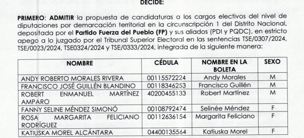 Mediante la resolución 35-2024, el Pleno de la JCE decidió corregir directamente la boleta, sacando a Paz, incluyendo al candidato más votado del proceso de encuesta de Fuerza del Pueblo en la posición 1, Andy Morales, y manteniendo a Selinée Méndez, que fue salvada por ser la mujer más votada.