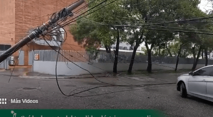 Poste del tendido eléctrico cae en la calle Pablito Mirabal con Eugenio Deschamps, sector La Castellana, como consecuencia de las lluvias a causa de la vaguada en el territorio nacional.
