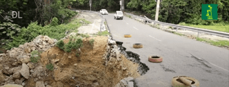 La escorrentía ha erosionado un tramo de los laterales de la vía, creando un derricadero de más 30 pies sin ninguna protección. La parte de menos peligro cuenta con barandas de protección y el tramo más peligroso solo advierte a los conductores con la colocación de neumáticos.