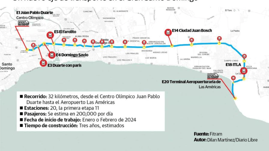 Se trata de una obra de 32 kilómetros de longitud, de los cuales 22 serían a nivel de la tierra, y gran parte del trayecto correrá por el farallón de la avenida Ecológica. En su etapa inicial, el tren tendrá una capacidad para transportar 200,000 usuarios por día y 20,000 pasajeros por hora. La primera etapa sería desde el Centro Olímpico hasta la Charles de Gaulle y luego hasta el Aeropuerto Internacional Las Américas.