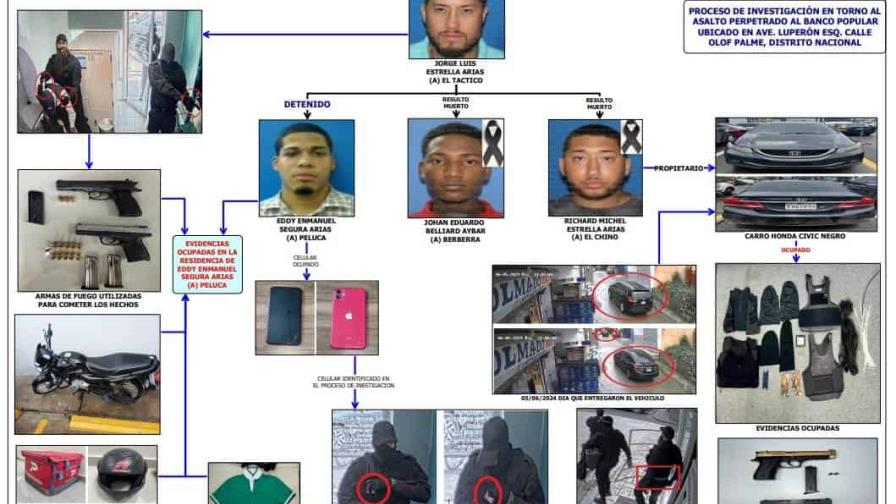 Ayer, la Fiscalía del Distrito Nacional solicitó a la Oficina de Servicios de Atención Permanente un recurso de prisión preventiva, como medida de coerción, contra Jorge Luis Estrella Arias (El Táctico) y Eddy Enmanuel Segura Arias (Peluca), imputados por el asalto a la sucursal del Popular, ubicada en la avenida Luperón, esquina Olof Palme. De acuerdo con la instancia del fiscal Ernis Josué Mella Medina, los apresados se asociaron con los hoy occisos Richard Michel Estrella Arias, conocido como El Chino, y Johan Belliard Aybar, alias Berberrá, para robar a mano armada la entidad financiera. Se les acusa de asociación de malhechores, robo ejerciendo violencia, haciendo uso de arma ilegal.