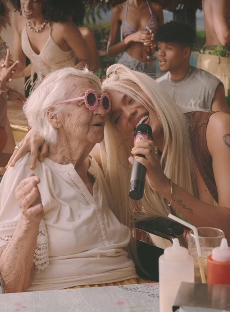 @alinosinesita conociendo el mar a sus 90 años», publicó Karol G este lunes en sus historias de Instagram junto a una foto de una de las actrices de su último videoclip.