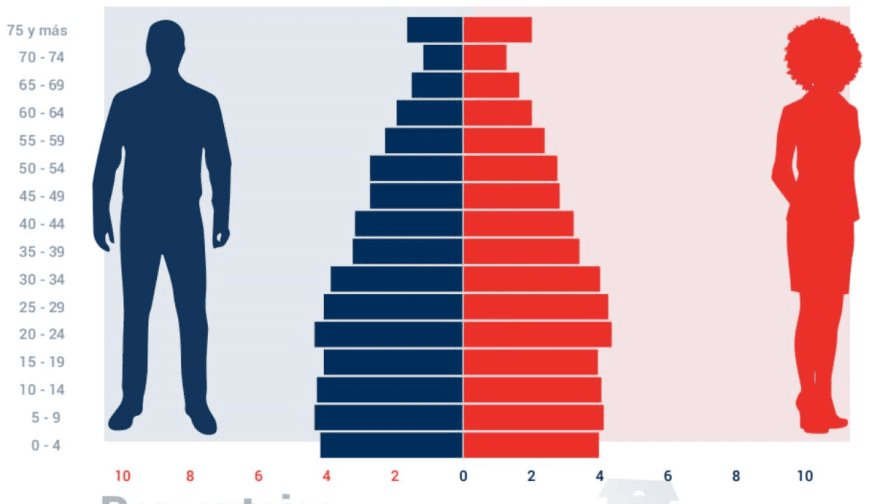 De igual forma, el grupo etario de 75 años y más, hay una mayor proporción de mujeres que de hombres, lo cual es típico en muchas poblaciones debido a la mayor esperanza de vida de las mujeres.