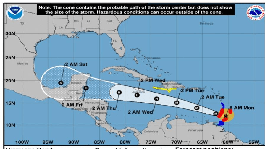 Según el Centro Nacional de Huracanes, se espera que Beryl siga siendo un gran huracán extremadamente peligroso a medida que su núcleo se mueve a través de Antillas Menores hacia el Caribe oriental.