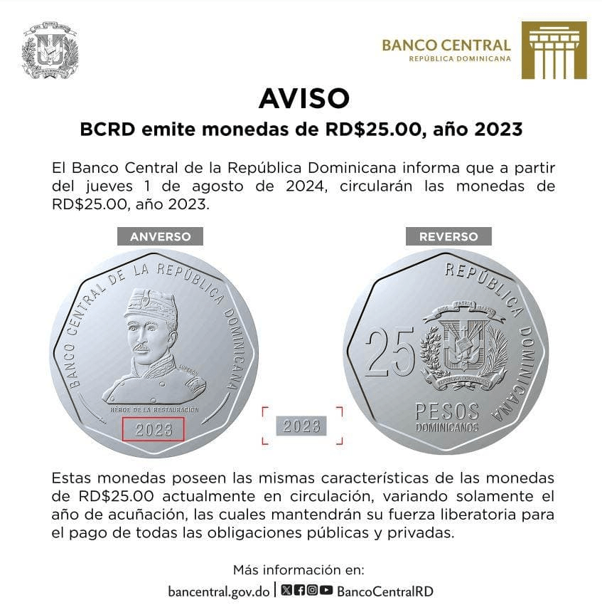El Banco Central de la República Dominicana (BCRD) anunció hoy que, a partir del jueves 1 de agosto de 2024, circularán las monedas de 25 pesos, año 2023.