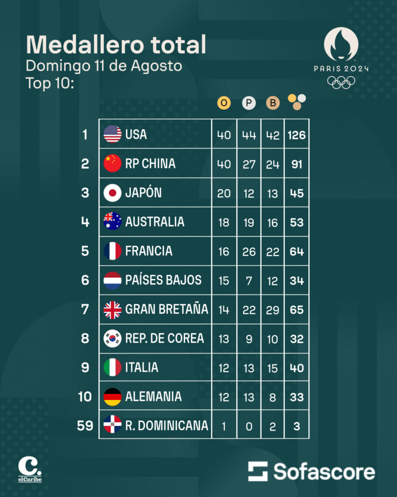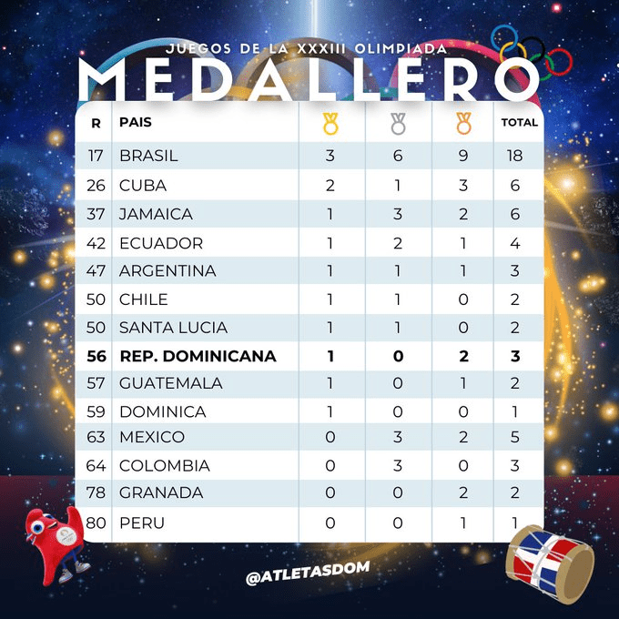 Con dos medallas de bronce y una de oro, República Dominicana quedó en el puesto 59 del medallero olímpico 2024. Por su parte, el país ocupa el octavo puesto en el medallero latinoamericano, encabezado por Brasil con tres de oro, siete de plata y diez de bronce.