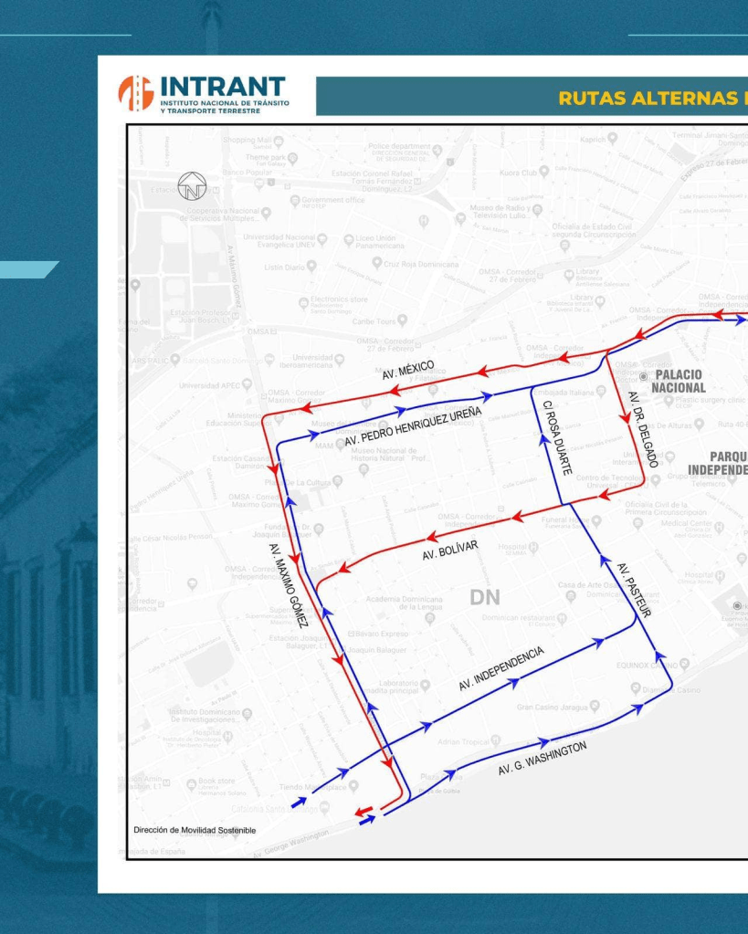 El Instituto Nacional de Tránsito y Transporte Terrestre (Intrant) informó este miércoles sobre la habilitación de rutas alternas, este jueves y viernes, en algunas zonas de la ciudad con motivo de las actividades de toma de posesión del presidente Luis Abinader.