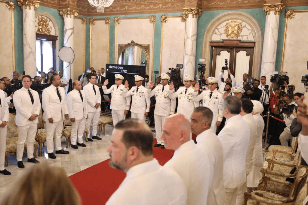 Acompañado de la primera dama Raquel Arbaje y de la vicepresidenta Raquel Peña, el gobernante dominicano tomó el juramento de los funcionarios, en un acto realizado en el Salón de Embajadores del Palacio Nacional, luego de ser investido con la banda presidencial en el Teatro Nacional Eduardo Brito que fungió como Asamblea Nacional.