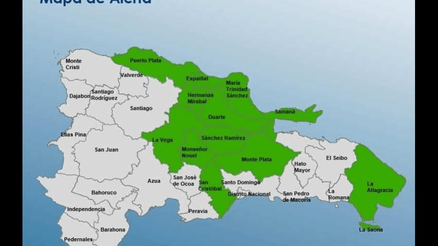 Las provincias en alerta verde son: La Altagracia, La Vega, Duarte, María Trinidad Sánchez, Monseñor Nouel, Hermanas Mirabal, Monte Plata, Puerto Plata, Espaillat, San Cristóbal, Samaná y Sánchez Ramírez.
