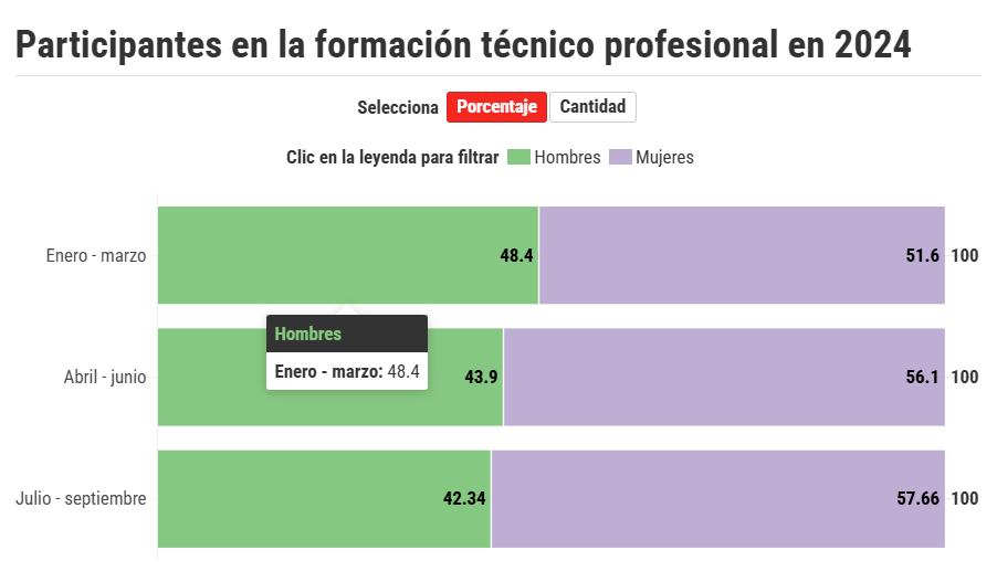 De enero a septiembre del 2024, un total de 730,009 personas accedieron a cursos técnicos en el país, de estas capacitaciones, las mujeres representaron la mayoría, 407,238 participantes, equivalente al 55.79 %, de acuerdo con las estadísticas de Oficina Nacional de Estadística (ONE).
