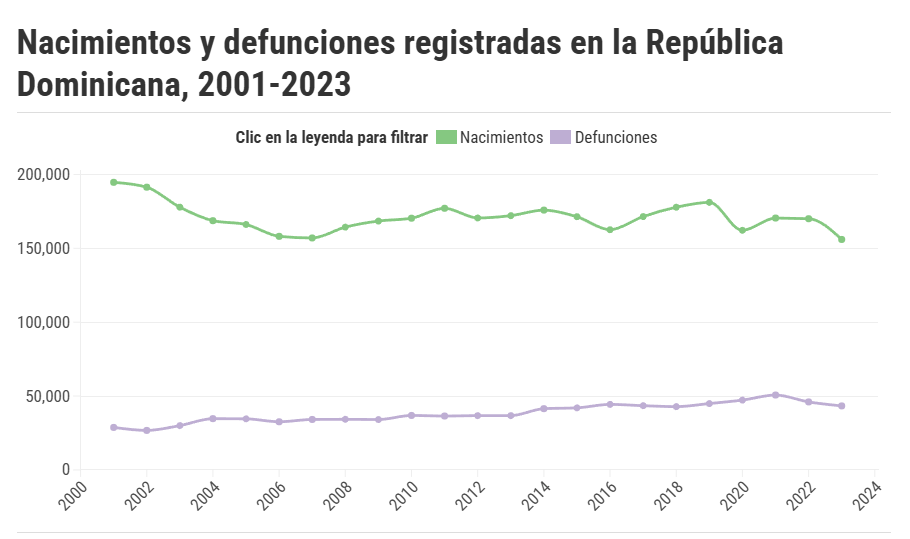 En los primeros 25 años de este siglo, la República Dominicana registró un importante crecimiento demográfico. Entre el 2001 y el 2023 nacieron 3,936,430 personas, mientras que 883,229 fallecieron, según datos de la Oficina Nacional de Estadística (ONE).