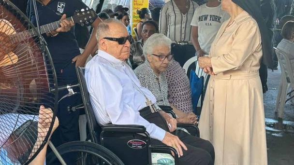 Un video lo muestra en silla de ruedas mientras comparte con presentes. Varias personas se acercaron a él para recibir consuelo. Estaban en una de las carpas instaladas en la zona.