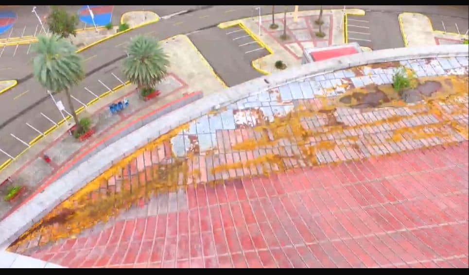 Imágenes obtenidas por Diario Libre muestran una gran parte de la superficie descolorida, con la goma impermeabilizante levantada y orificios sobre el techo. Fuentes consultadas aseguran que le fueron sustraídas planchas de cobre, sustituidas por láminas de zinc menos resistentes a la gran acumulación de agua cuando.
