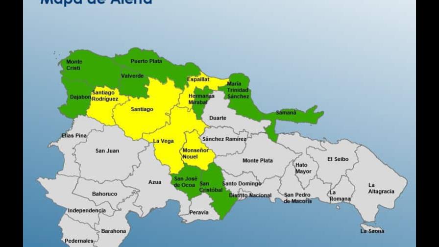 Mientras que en alerta verde se encuentran: María Trinidad Sánchez, San Cristóbal, Puerto Plata, Valverde, Samaná, Hermanas Mirabal, Montecristi, Dajabón y San José de Ocoa.