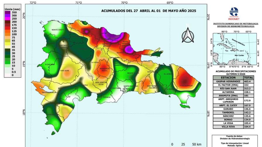 El Instituto Dominicano de Meteorología (Indomet) informó que, del 27 de abril al 1 de mayo, la provincia Espaillat ha registrado el mayor cúmulo de precipitaciones, con 463.4 milímetros de lluvia, cuando normalmente, en este mes, esa provincia alcanza 157 milímetros.